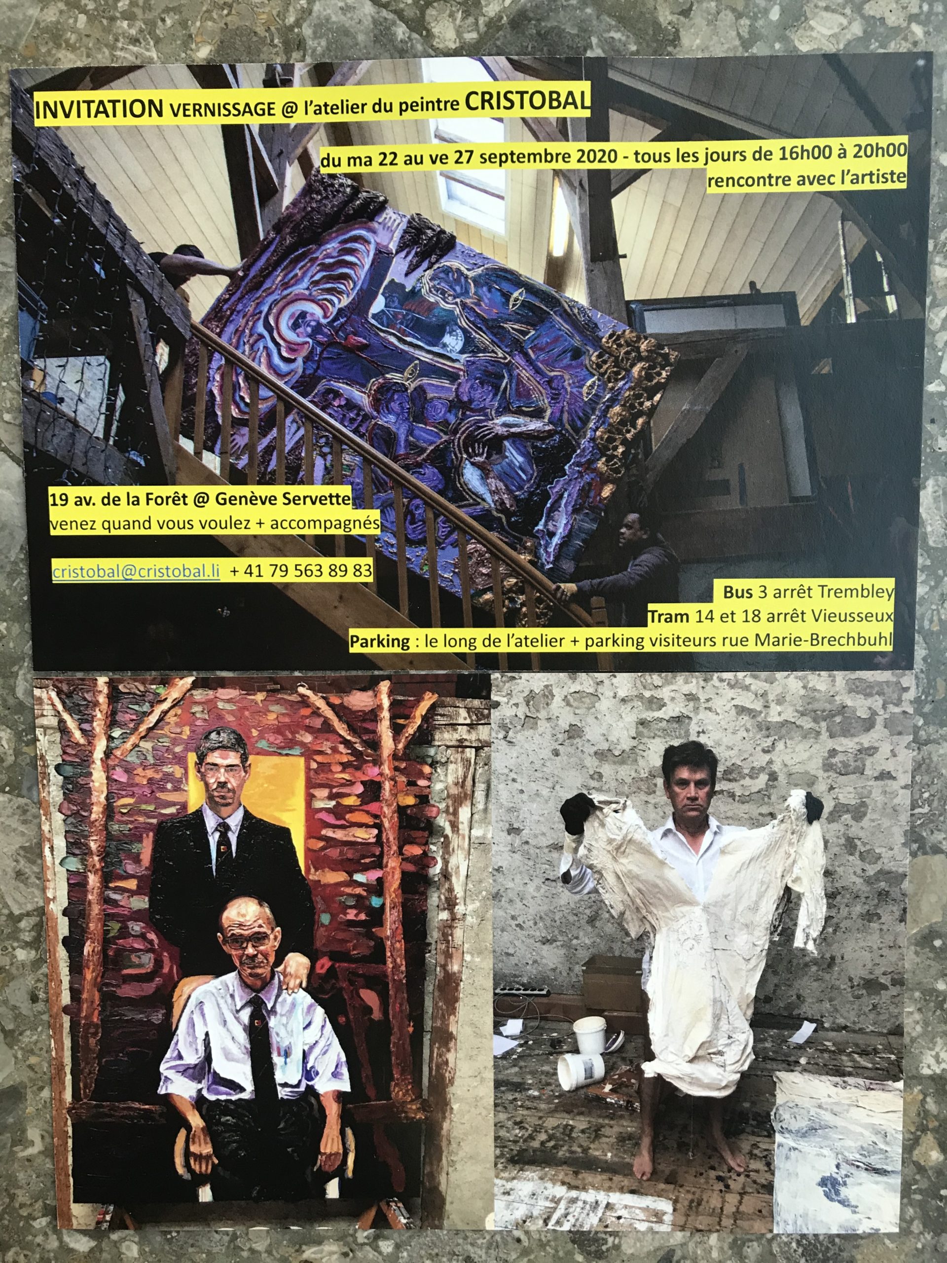Construisant moi-même l’armature de mes peintures, je ne me suis pas rendu compte de la continuelle augmentation de la taille de mes formats. Le triptyque de ma rédemption, ce sont 3 panneaux de 3 mètres sur 2, soit un espace mobilisé de 3 mètres sur 7 mètres. Ceux-ci ne passent plus les portes, au sens littéral du terme. Aussi ai-je le plaisir de vous inviter à un vernissage @ mon atelier, du mardi 22 au dimanche 27 septembre 2020, chaque jour de 16h00 à 20h00 @ avenue de la Forêt 19, quartier Servette, Genève.