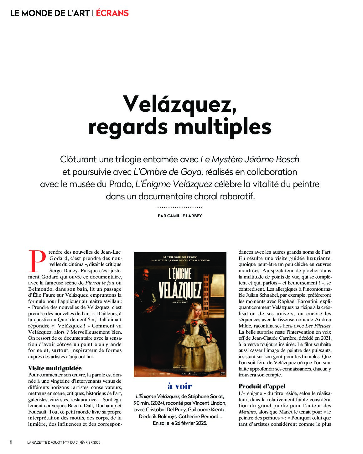 L’ensemble de la critique est unanime. Et le succès du film qui a dépassé les 50’000 entrées en France le confirme. Le public aspire au beau, au dépassement de soi, et c’est la magie Velasquez qui opère.