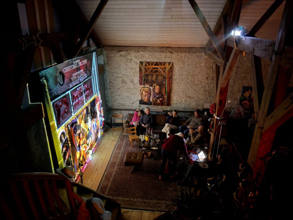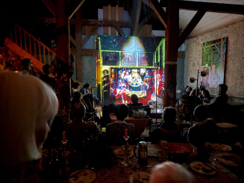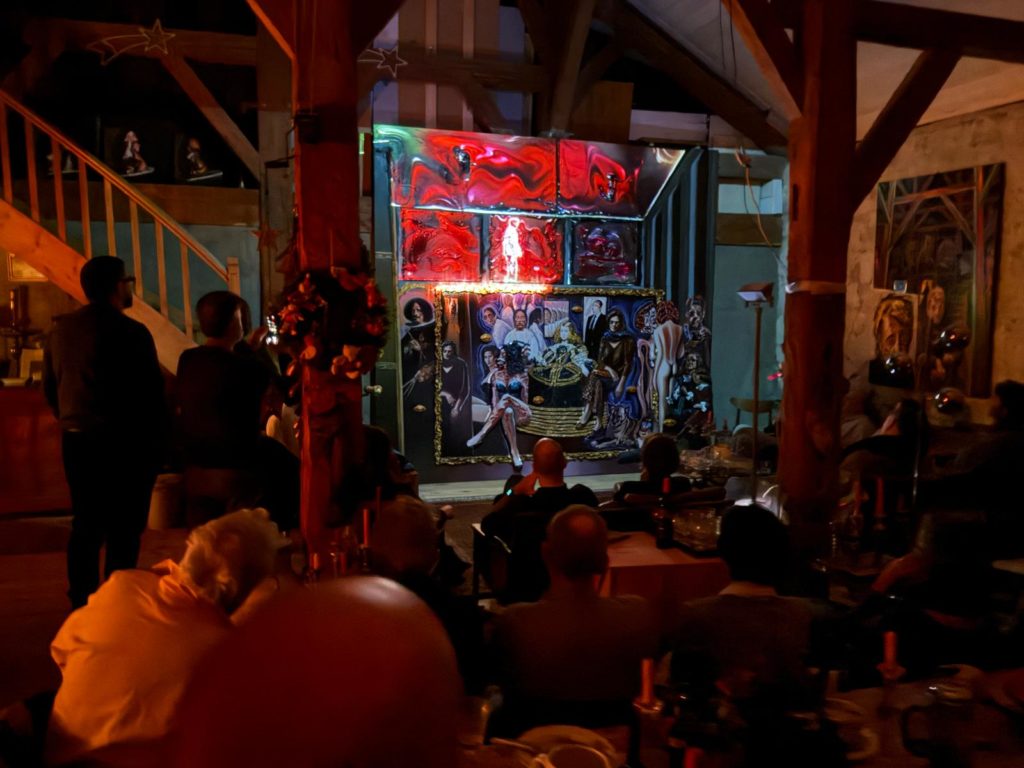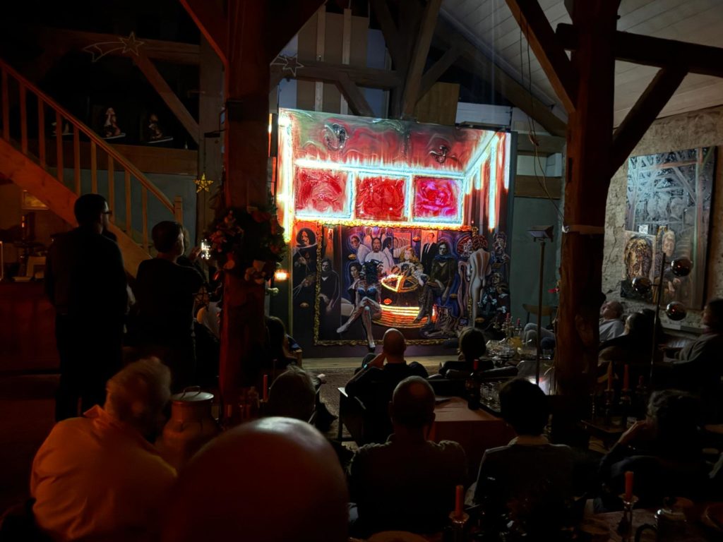 Plus de 60 personnes sont venues voir ou revoir le Mapping exceptionnel produit et conçu par Cristobal Del Puey sur son tableau de 3.40 x 3.50 m, accompagné d’une musique envoûtante.